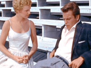 Of course, Dorie’s in a non-win situation–it’s 1956, and you don’t have children out-of-wedlock (at least on film); you also don’t have a back-alley abortion (again, at least not on film). In addition, Dorie’s father is apparently such a jackass that he would cut her off entirely if she were to elope with her boyfriend, the only real out she has in a movie abiding by the Production Code. The problem of course, is that Bud doesn’t really give a damn about Dorie–he’s been researching her father’s company, Kingship Mining, and is after only her money. What Dorie sees in Bud is beyond me, since he merely fains interest in her most of the time–maybe it’s some stock Freudian message (so popular at mid-century) where she’s looking for someone like her father.