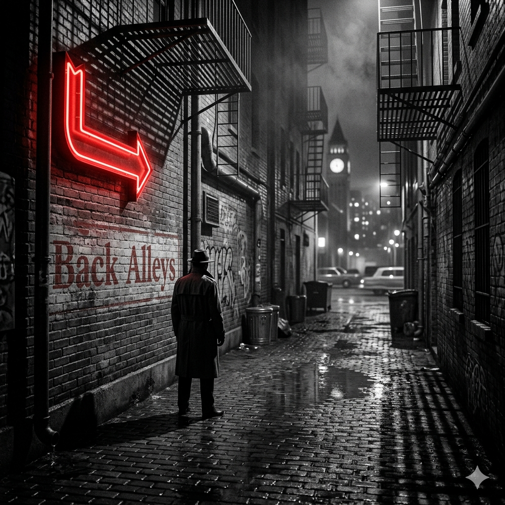 The back alley is the nervous system of film noir’s urban body — a place where the city’s wealth drains away into garbage and shadow, and where deals, betrayals, and murder occur just steps from the respectable street. Cinematographers lit these cramped passages with a single overhead bulb or a slant of moonlight to create corridors of pure menace. In back-alley noir, the architecture itself becomes a threat, closing in on characters who have run out of legitimate avenues. These are the places where the city’s pretenses drop away and its true face — mercenary, indifferent, lethal — is finally revealed.