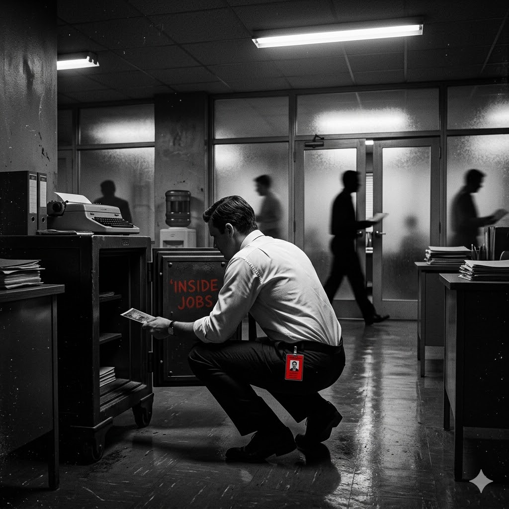 The inside job is film noir’s most cynical variation on betrayal: the person who has been trusted with access, information, or authority turns that trust into a weapon. These criminals are not outsiders pressing against the walls of legitimate society — they are inside those walls, and their criminality is therefore a kind of institutional decay. The inside job noir often begins as a police or corporate procedural and then reveals that the enemy is not the external criminal but the colleague, partner, or employer who has been corruption all along.